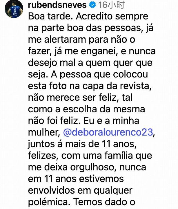 昨日,一葡萄牙杂志tvguiarevista发布新刊,将内维斯与若塔遗孀的一张照片放上了封面,并配文“自若塔去世以来,内维斯一直是Rute的精神支持,他们比家人还亲密”,内维斯随后在评论区进行回击,称“选择这张照片的人和发布这张照片的一样不幸”。