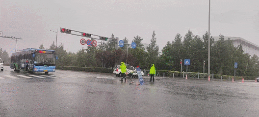 ▲突降暴雨,交警们雨中执勤,维护现场交通秩序。