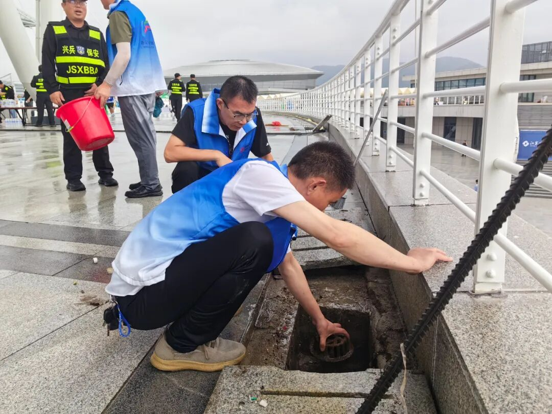 ▲雨后,工作人员紧急清理积水。